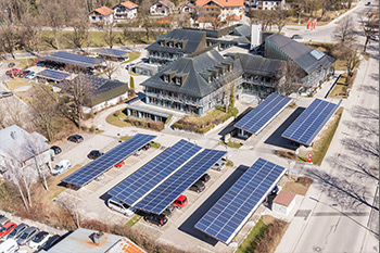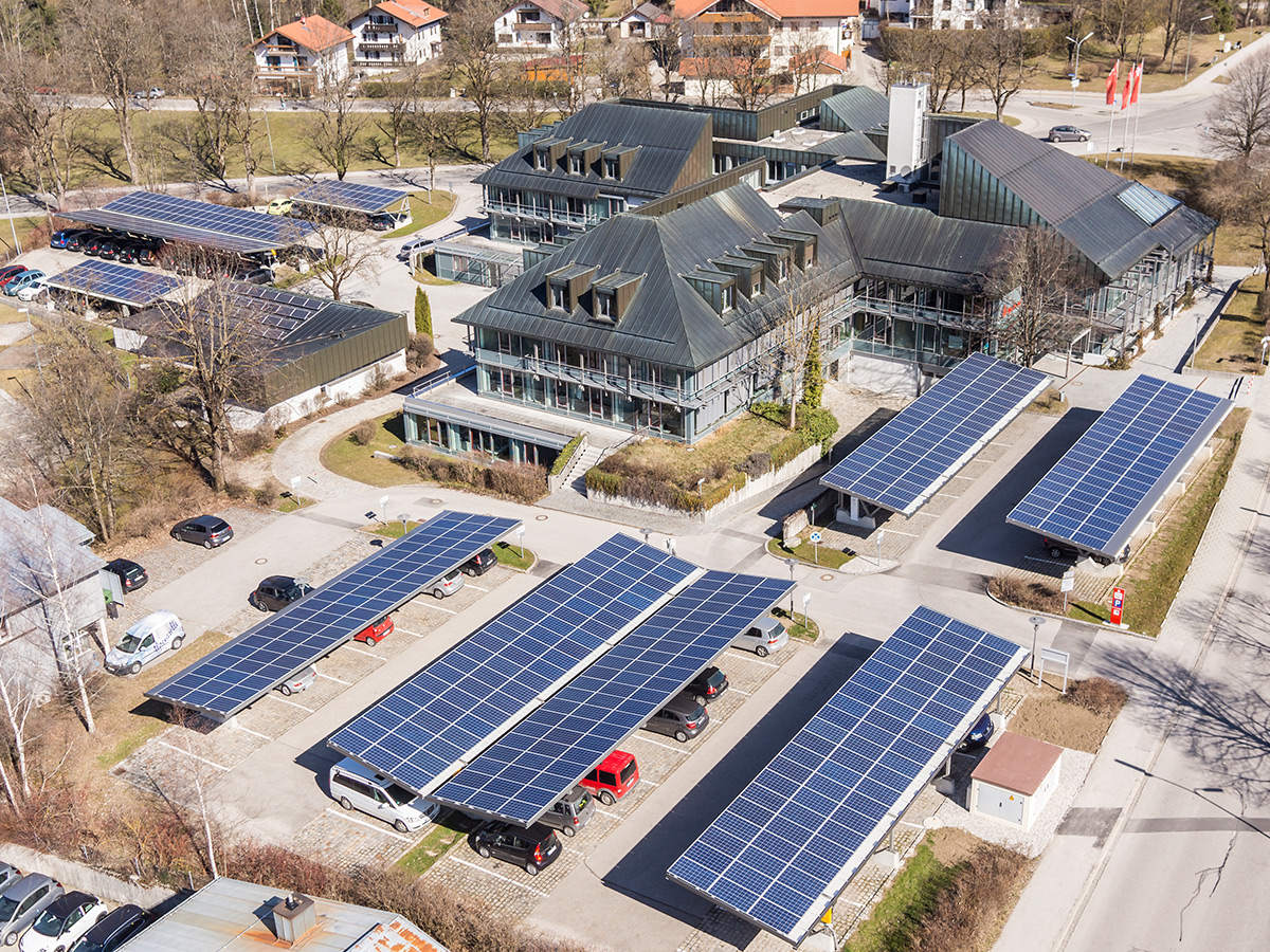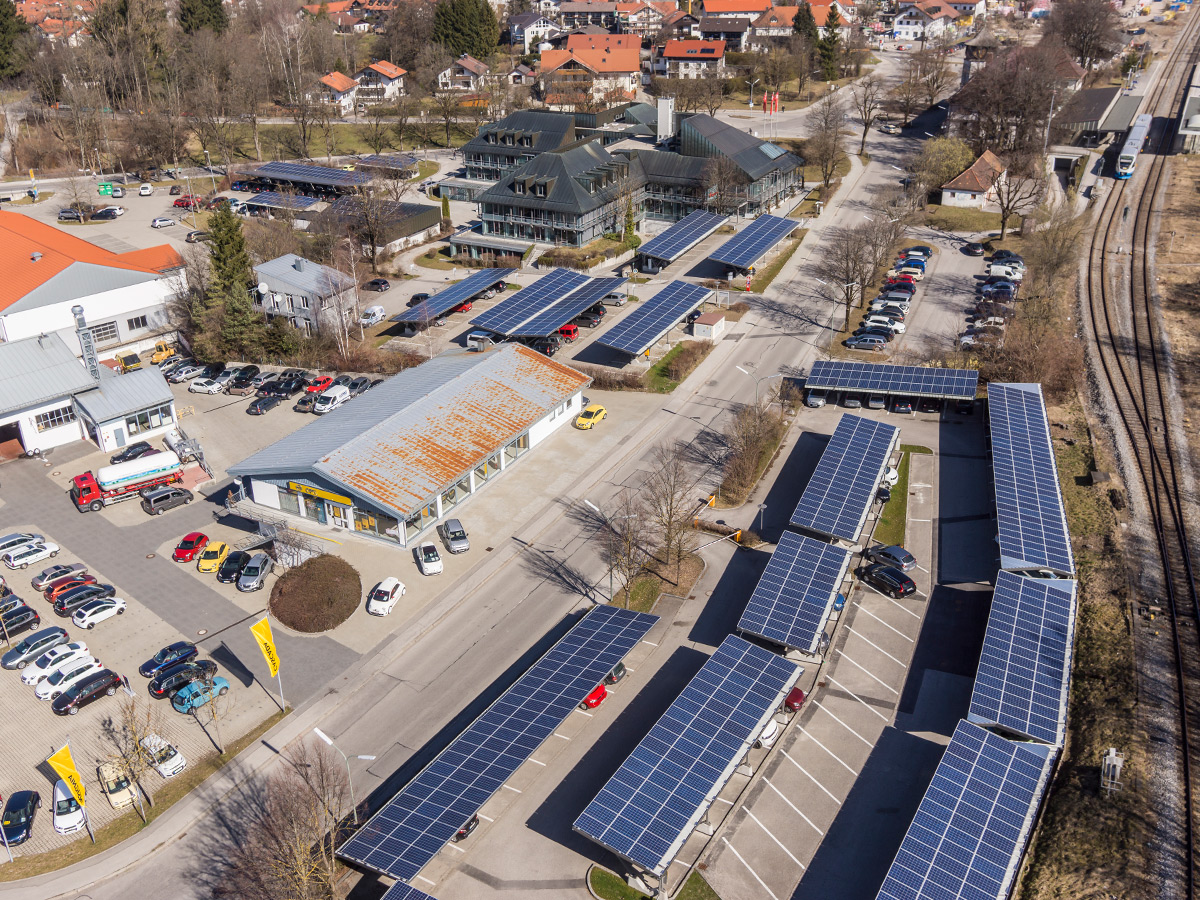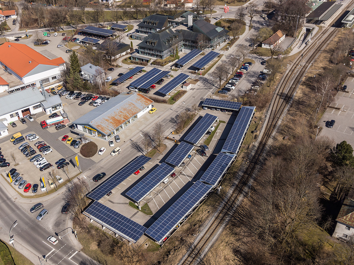 Carport Sparkasse Bad Tölz - 0,288 MW / Trina PC05 245 Watt. Wechselrichter: SolarMax, Bauzeit: 8 Wochen