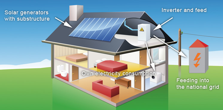 The energy generated by a photovoltaic system is first fed into the home network. Here, the solar energy from electrical devices can be used within the house: which is then called consumption or self-consumption. If more power is available than can be consumed, the excess flows into the national grid. If there is not enough solar power to meet their individual consumption, the required quantity is drawn from the grid.
